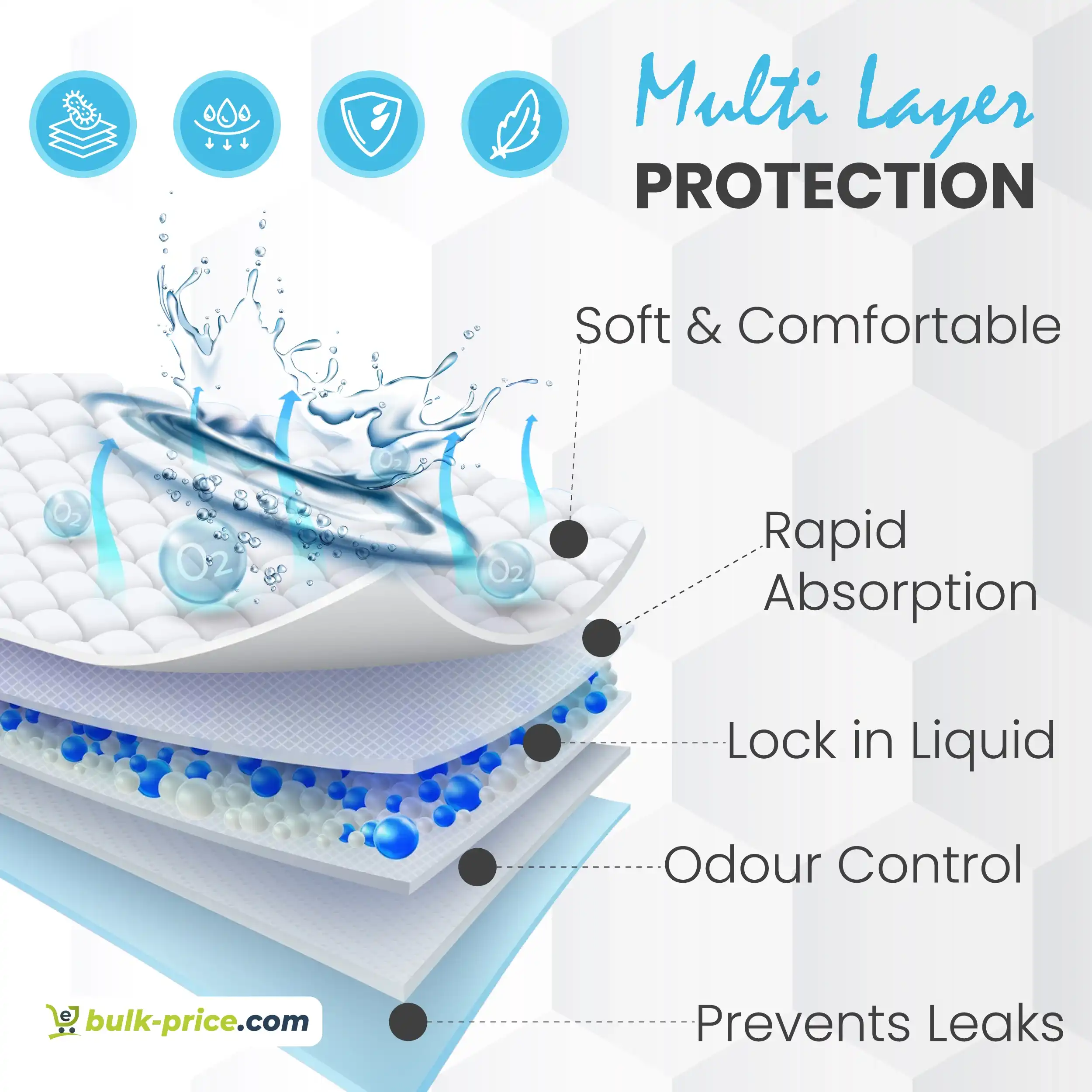 - High-Absorbency CoreDesigned to absorb large volumes of liquid quickly, helping prevent wetness, odor, and discomfort.