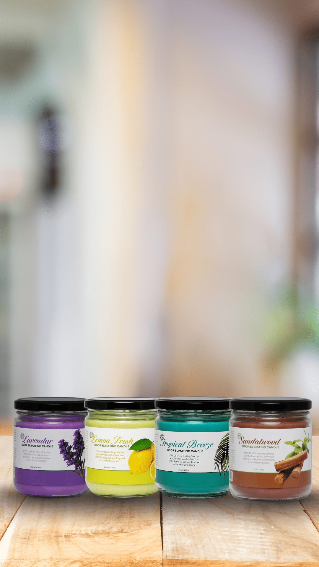 Odor-eliminating candles naturally refresh your space with scents like tropical, lavender, sandalwood, and more—perfect for any mood.